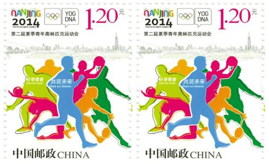 中国邮政定于8月16日发行1套1枚青奥会纪念邮票,面值为1.20元。邮票规格为30*40mm,共20枚。邮票图案主要表现了乒乓球、艺术体操、羽毛球、篮球、跑步等运动项目,通过活泼、轻快的用色,展现出青春与活力,同本届青奥会的主题“分享青春、共筑未来”相对应。邮票的背景为南京城的速写,包括明城墙和现代标志性建筑紫峰大厦等,色调润泽、淡雅,突出了“绿色南京”的城市理念。